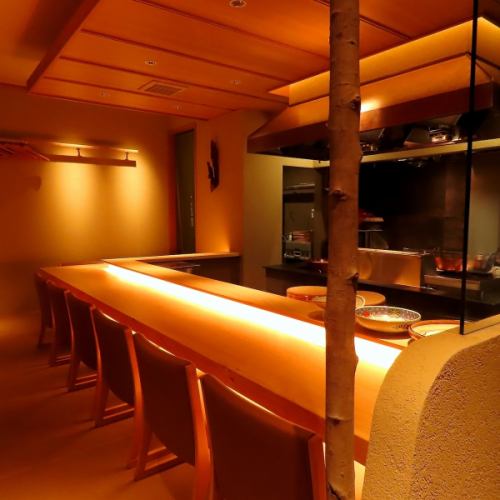 【나무의 따뜻함에 싸이는 세련된 비일상 공간】점내는 「나무 새는 날」을 테마로, 목재와 간접 조명을 능숙하게 사용한 차분한 공간.카운터석에서는 장인의 수공을 가까이에 느껴 마치 극장과 같은 현장감.조용하고 세련된 분위기가 특별한 시간을 연출합니다.